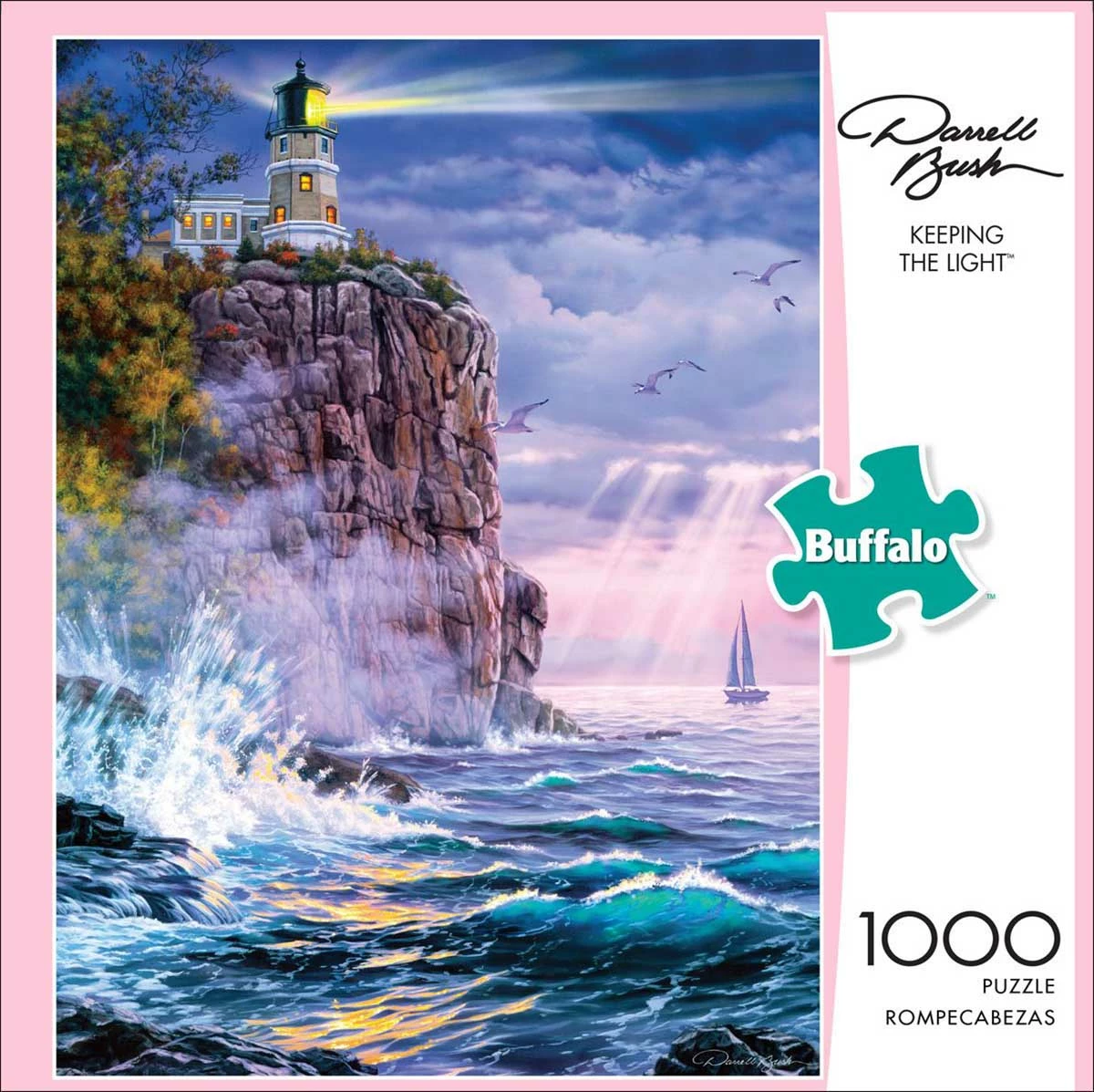 Keeping the Light is a 1,000 piece jigsaw puzzle, by artist Darrell Bush. Keep your light on at night to enjoy piecing together this beautiful puzzle. It features a lighthouse on a rocky cliff with its light shone over the choppy nighttime waters as a sailboat passes by and the waves crash against the shore.Β