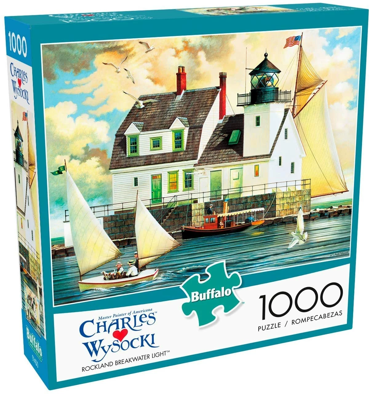 Rockland Breakwater Light is a 1,000 piece jigsaw puzzle by artist Charles Wysocki. These sailors and fisherman are on the coastal waters of the Northeastern United States. Today, they will be out at sea enjoying the ocean views.