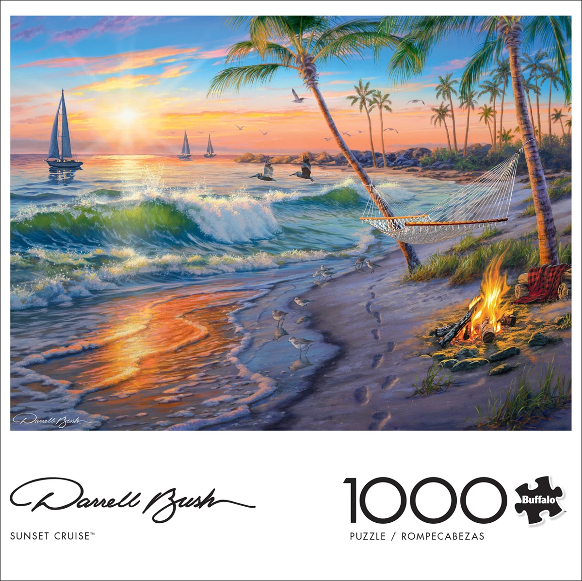 This 1000-piece jigsaw puzzle, Sunset Cruise, is based on the artwork of Darrell Bush. Relax in a hammock next to a campfire on the beach as the sun sets on the water. Sailboats can be seen beyond the crashing waves. Palm trees are scattered throughout the sand and different birds fly overhead looking for their next meal.