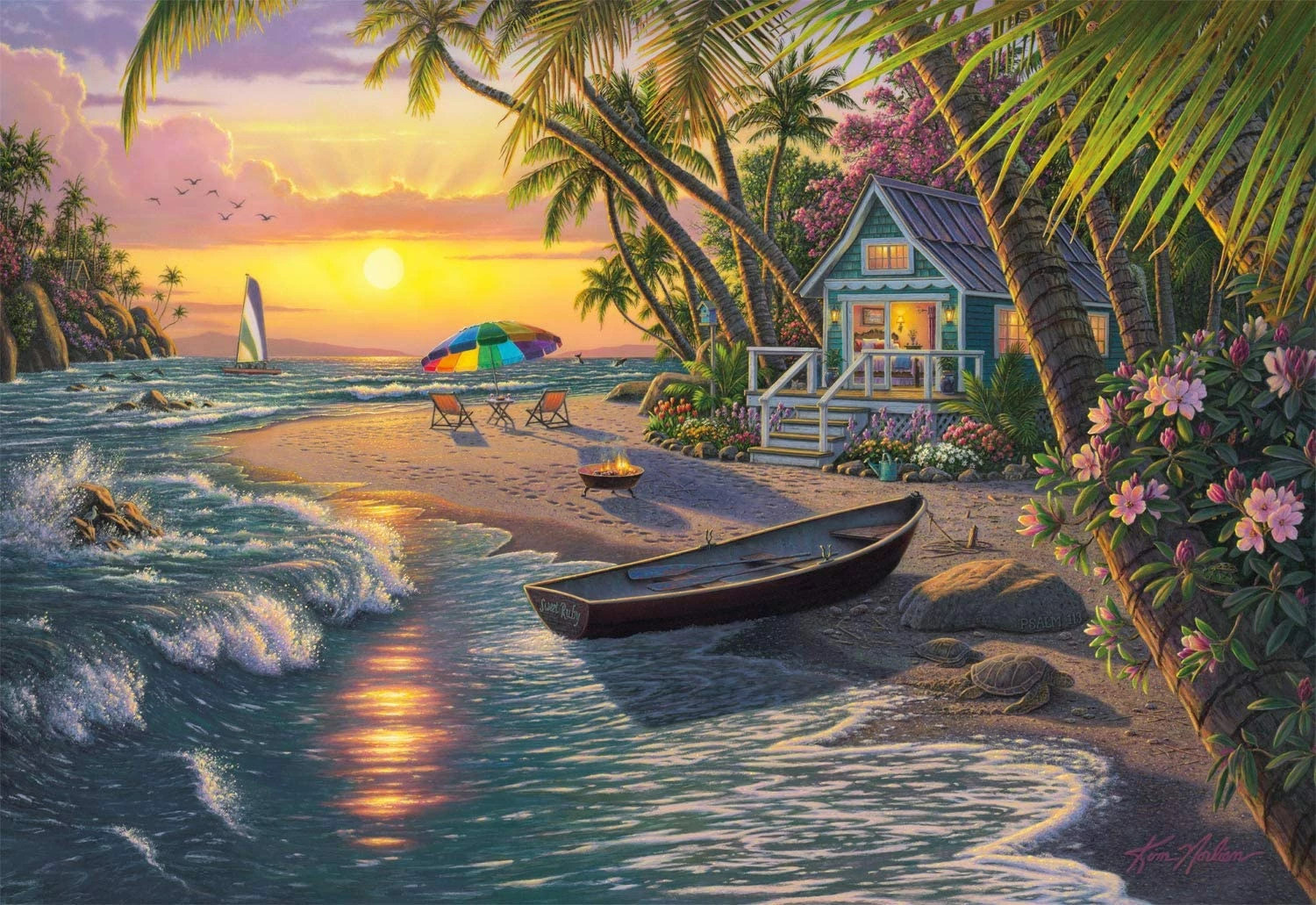 This 2000 piece puzzle, titled Sunset Beach, captures Kim Norlienβs work through a beautiful remote home nestled on the edge of a tropical beach. Hear the sounds of rushing waves, in this depiction of a beach oasis. But keep your eye out, there are 12 hidden images in this puzzle!