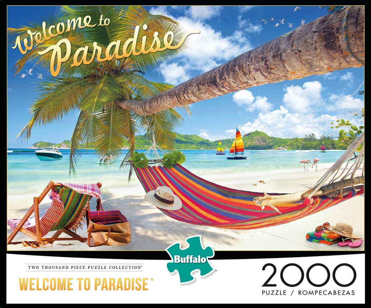 Welcome to Paradise! Kick back and enjoy piecing together this 2000-piece puzzle from Buffalo Games. White sand beaches sprawled beneath the palm tress set up the perfect getaway from the hustle & bustle. Relax as the flamingos play and take a dip in the crystal blue waters under the perfect summer sky. This puzzle will have you feeling the summer vibes!