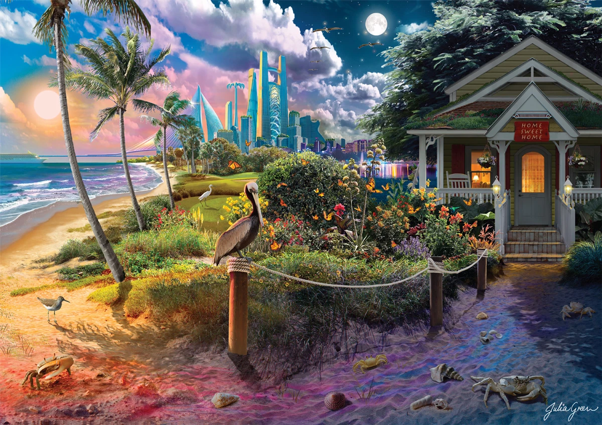 21.25 x 15 This 300 large-piece puzzle from Buffalo Games is titled Beach Cabin from the Night & Day series. During the day enjoy some time relaxing at the water and when night falls retreat to a cozy cabin surrounded by flowers. It looks like there is even some wildlife that has come to visit this charming getaway. The Night & Day Series captures the energetic ebb and flow from dawn ’til dark of different well-known landmarks around the world.The pieces of this puzzle are larger than traditional puzzle pieces, which makes them easier to see and hold for a pleasant puzzle experience.Β