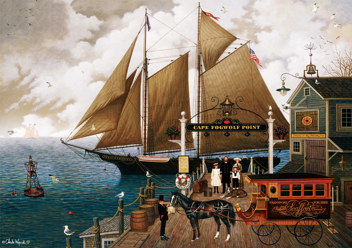 Visit Cape Fogwolf Point in this 300-large piece jigsaw puzzle, Captain Kirby Beemish, by Buffalo Games from the work of artist Charles Wysocki. A clipper ship is docked at port waiting on its next adventure. The captain and his family pose in front of the ship with their dog while a carriage driver feeds his horse.
