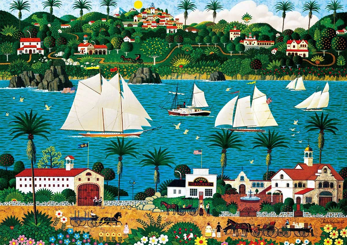 Witness California, before the rise of Hollywood and Entertainment. Experience this landscape, including colonial Spanish buildings, horse drawn buggies and the infamous palm trees that still cover southern California to this day. This 300 large piece jigsaw puzzle is titled Old California, by artist Charles Wysocki.