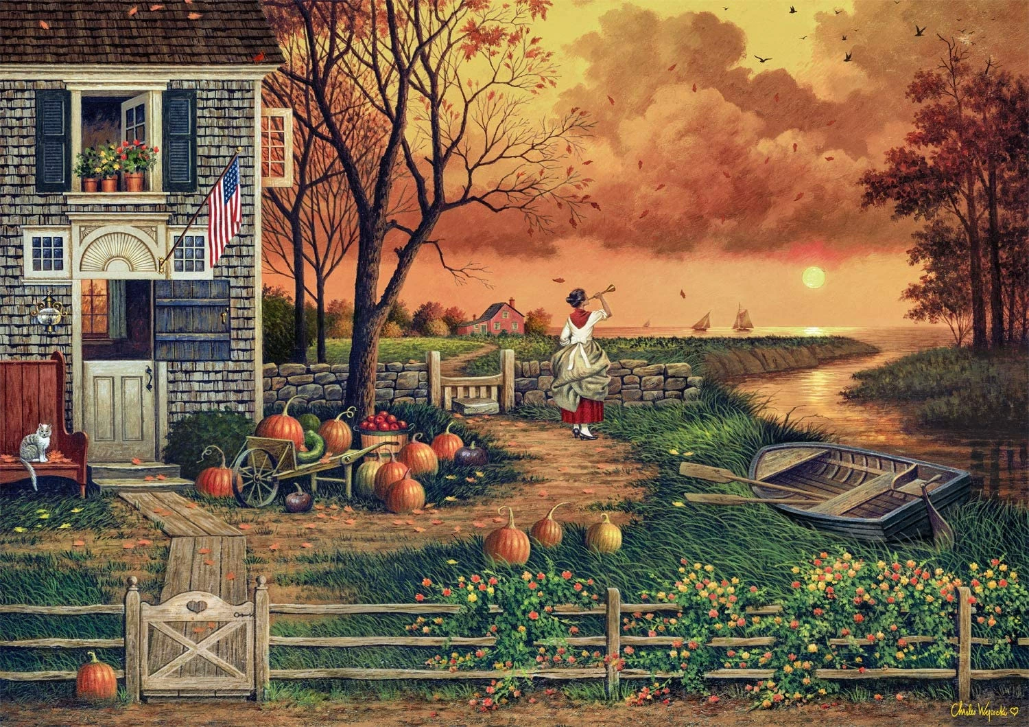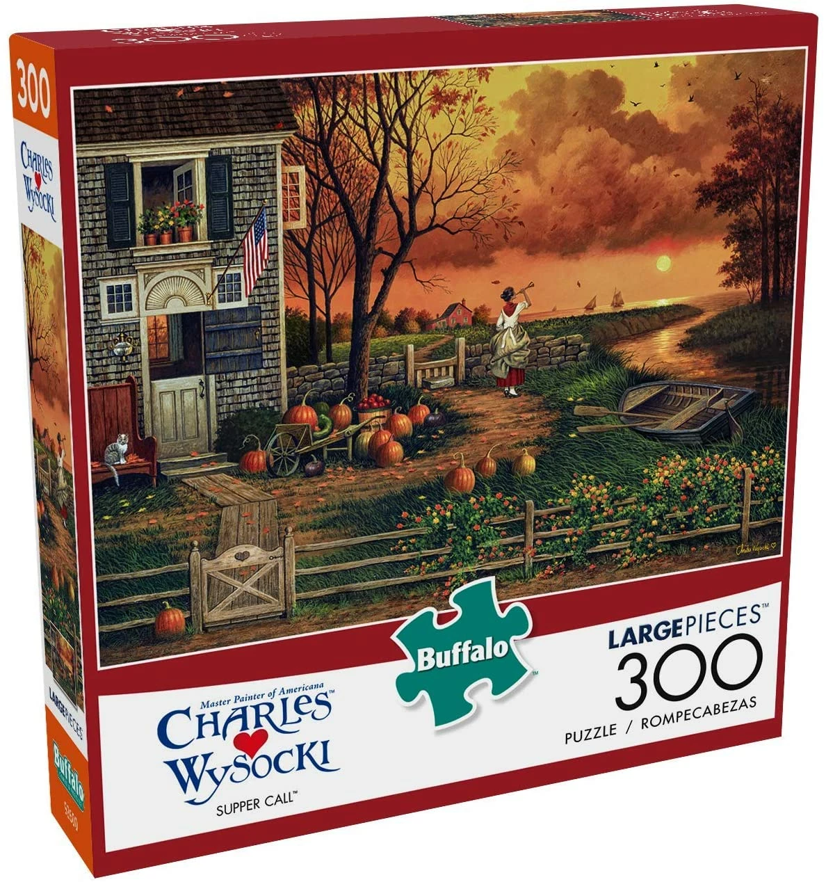The sun begins to set on this quiet home on the coast, and evening supper is just about ready. With the sound of the horn, the boats sail towards home. Dinner awaits! This 300 large piece jigsaw puzzle is titled Supper Call, by artist Charles Wysocki.