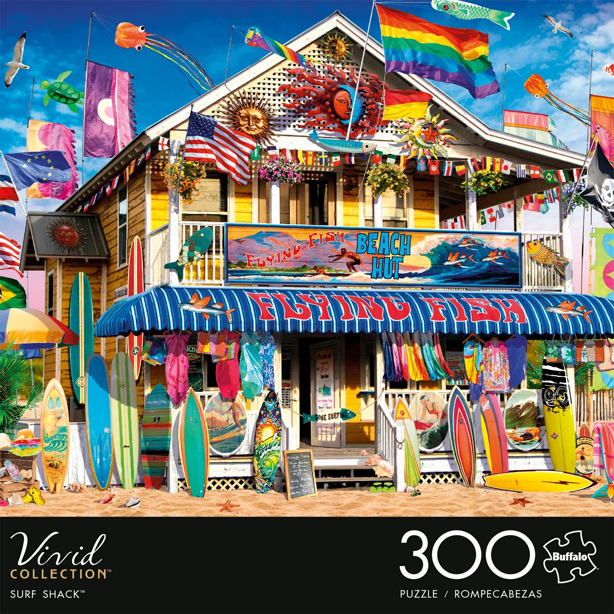 This 300-large piece puzzle titled Surf Shack is from the Vivid Collection by Buffalo Games. This fun and colorful surf shack has everything you’d need for a day at the beach. From flags of various countries, to decorative suns, and, of course, plenty of colorful surfboards to choose from!
