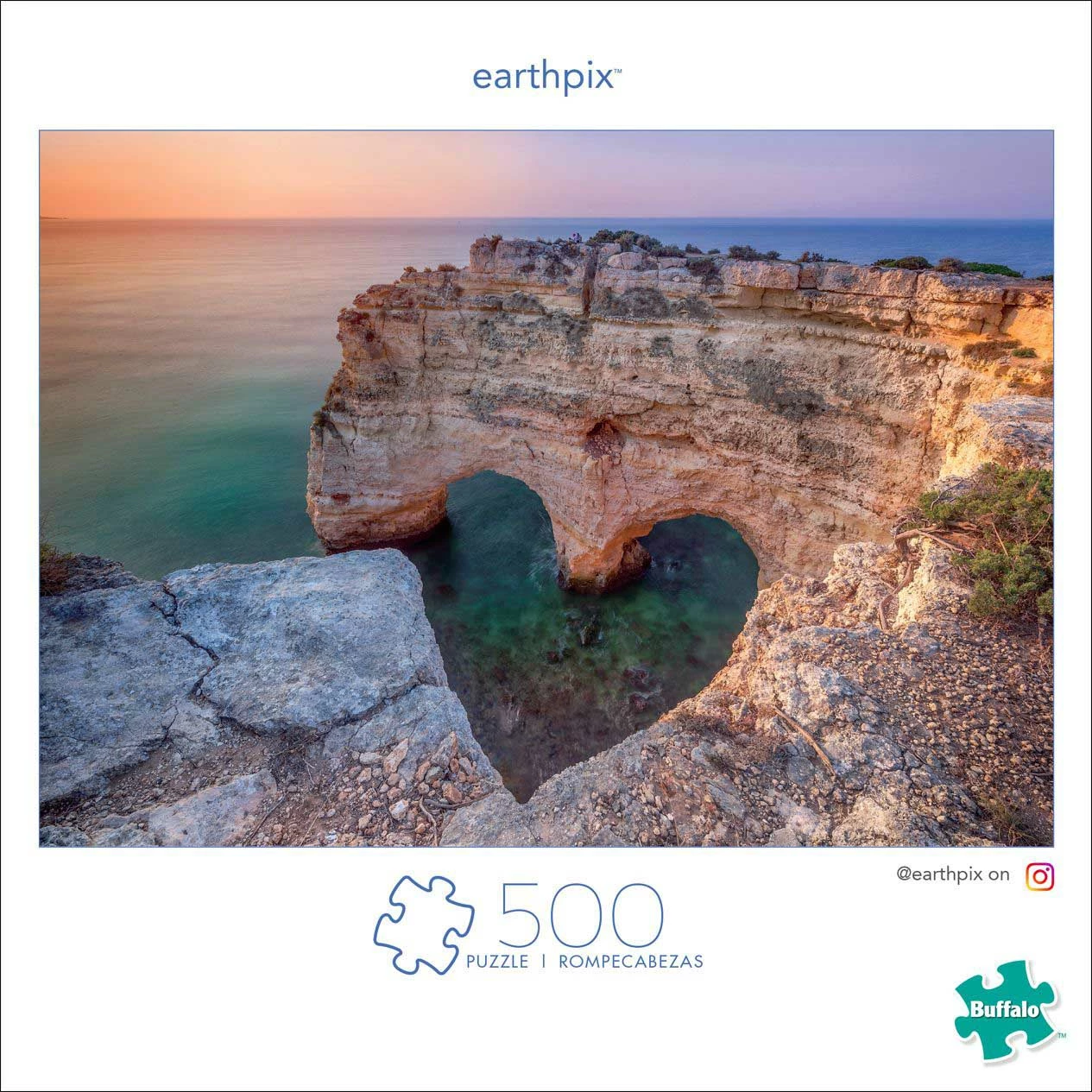 This 500-piece jigsaw puzzle titled βHeart of the Coastβ is from the Earthpix series by Buffalo Games. This puzzle features Algarve, the beautiful southern coastline of Portugal, where if you look at just the right angle you can see a heart shape created by the rocky coast. This region is famous for stunning beaches, picturesque fishing towns and a glorious climate. Earthpix is the ultimate social media-based community that showcases amazing pictures of places, people, animals, and nature from around the globe with over 15 million followers.Β