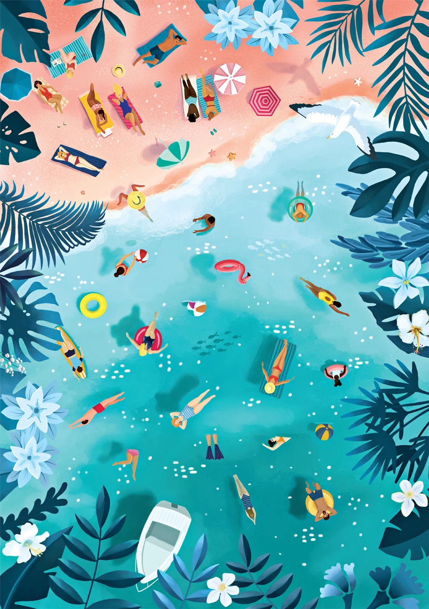 Tropical Umbrellas is a 500-piece jigsaw puzzle by Buffalo Games. This puzzle contains images of people relaxing on a tropical beach and floating in the water. Tropical palm leaves surround the border of this relaxing puzzle. Would you be reading on the beach or swimming in the ocean?ย