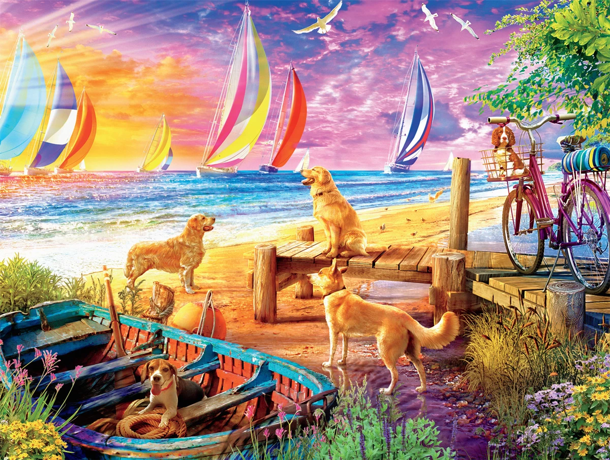 This 750-piece jigsaw puzzle from the Dog Days series by Buffalo Games is titled Dog Day at the Pier. This puzzle features some playful pups hanging out at the pier. The sunset lights up the shore and brightly colored sails can be seen in the water.