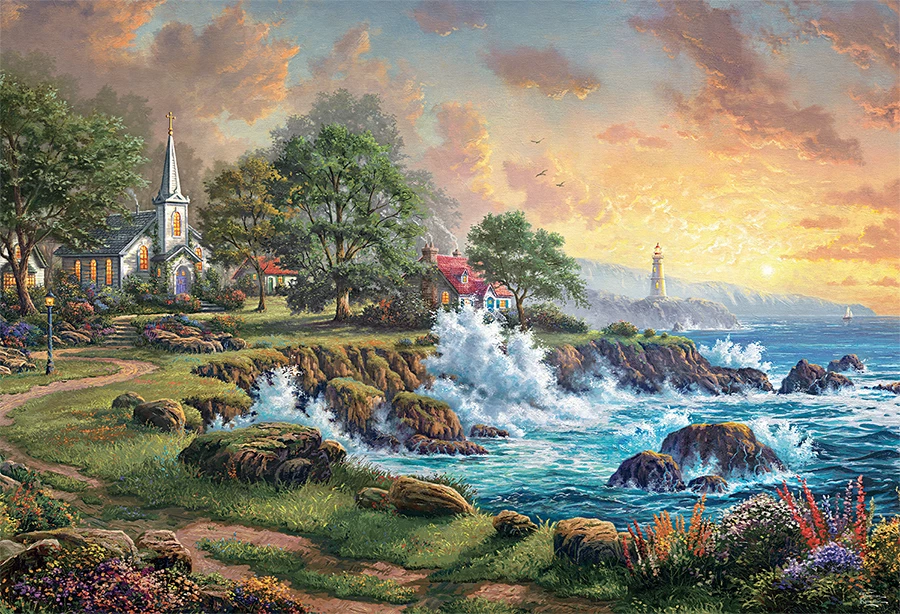 The ocean waves crash on the shore and the sunsets on this scene from artist Thomas Kinkade.