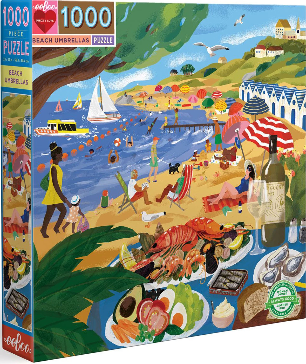 Beach Umbrellas 1000 piece puzzle gives an artistic nod to the graphic travel posters of an earlier time. This puzzle scene embodies a perfect seaside holiday: you can almost feel the sand between your toes and smell the ocean air. Details include colorful beach umbrellas, a green countryside, water activities and a bounty of fresh food with the day’s catch in front of you. To be followed, of course, by a long siesta! Illustrated by Lucia Calfapietra.