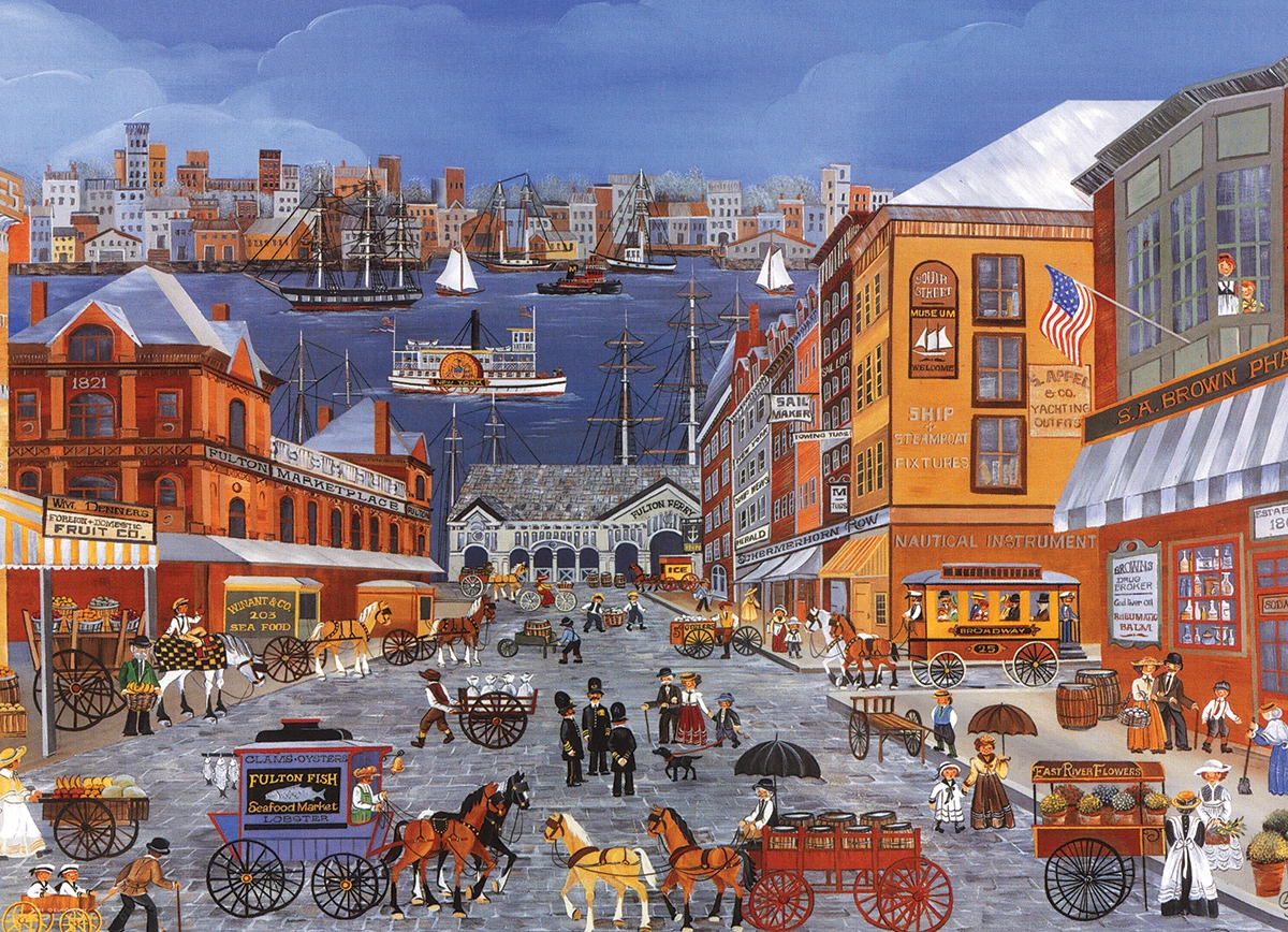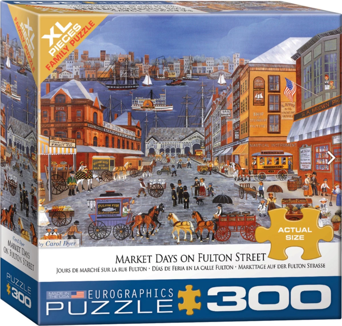 EuroGraphics Market Days on Fulton Street 300-Piece Puzzle (Small box). Box size: 8″ x 8″ x 2.37″. Finished Puzzle Size: 19.25″ x 26.5″. Taste the delights of a market day right on the beautiful shoreline of the bay. Shop, eat or get ready to set sail across the bay for an afternoon of fun and adventure!