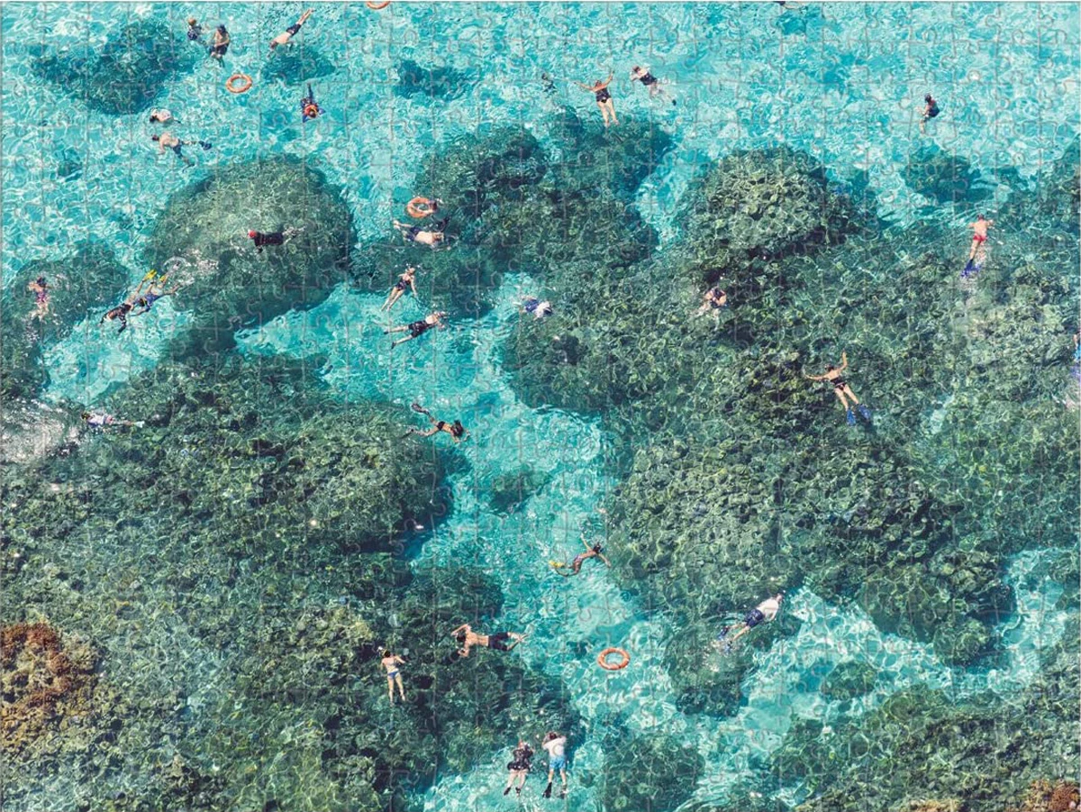 Gray Malinβs awe-inspiring aerial photography is shot from a doorless helicopter, creating stunning visual celebrations of color and repetition. This two-sided 500 piece puzzle features sunbathers basking on a sandy beach on one side and snorkelers exploring a stunning ocean reef on the other side. This two-sided puzzle is the perfect gift for puzzle and fine art photography enthusiasts alike.