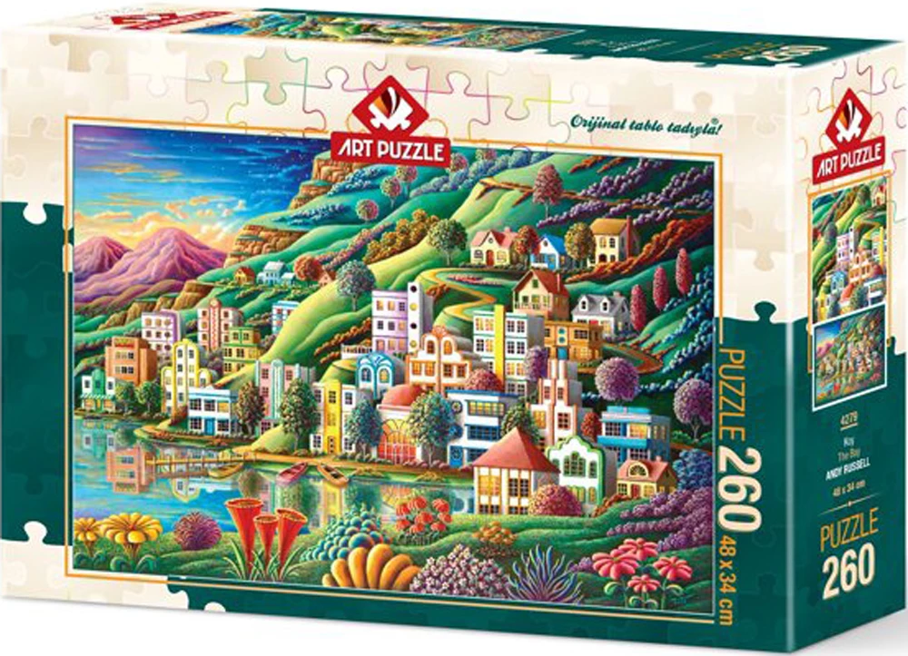 Lose yourself in the dream-like setting. Unique architecture reflects in the mirror of the calm waters while colors unfurl across the rolling hills. As time passes, your breathing will relax and, with the last piece, you’ll feel as refreshed as if you had taken a holiday to The Bay. Heidi’s 260 pieces are made with monoblock knives. Each part has different cuts. No piece will sit anywhere else. 2 mm blueprinting is done without touching the cardboard production. For ages 8+ By Andy Russell