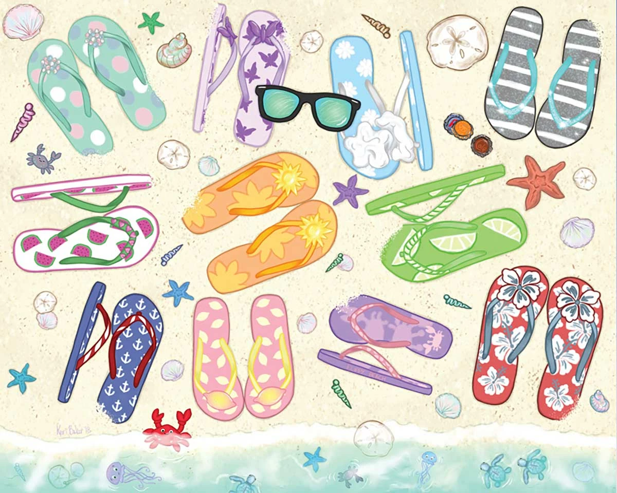Flippy beach is a whimsical take on a familyβs flip flops left at the edge of the water. Β Sprinkled among the flip flops you will find some fun sea creatures along with other beach stuff you donβt take into the water with you. Β A fun puzzle by artist Keri Baker.