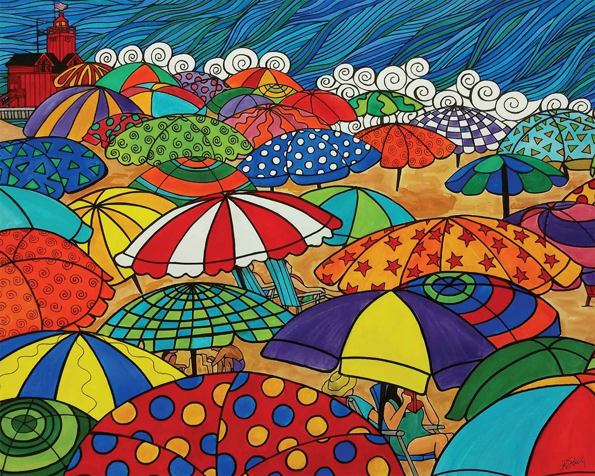 A sea of umbrellas to protect you from your day in the sun at the beach. Β A fun, 1000 piece puzzles painted by artist, Carolyn Stich.