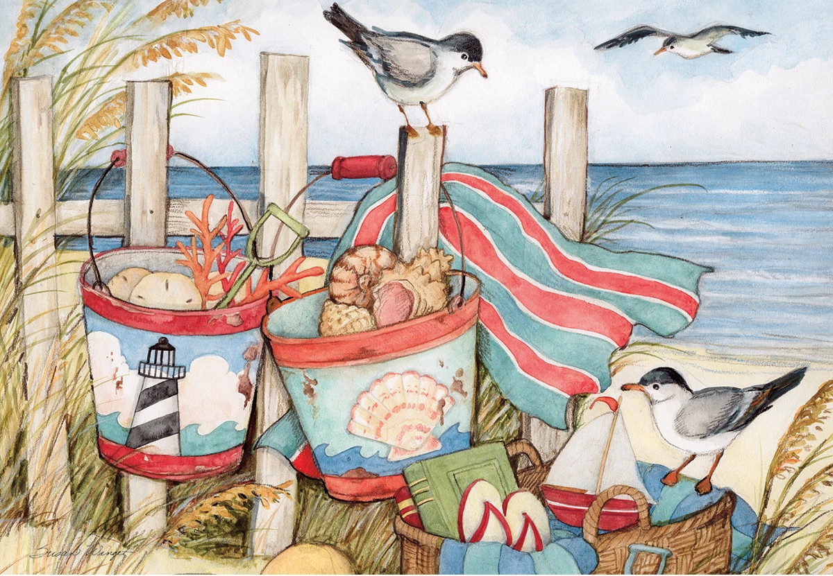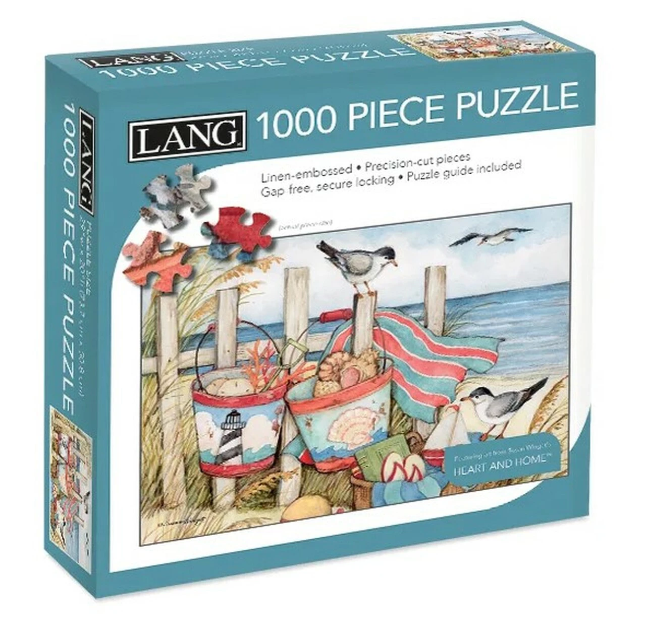 LANG jigsaw puzzles are a fun and challenging activity to take on with your family and friends. Assemble the Sand Buckets 1000 Piece Puzzle to form a painting by Susan Winget of a seaside beach scene. Each piece is finished with linen-embossed paper so the completed piece looks like one large canvas! If you get stumped, an art guide print is included to help you out.