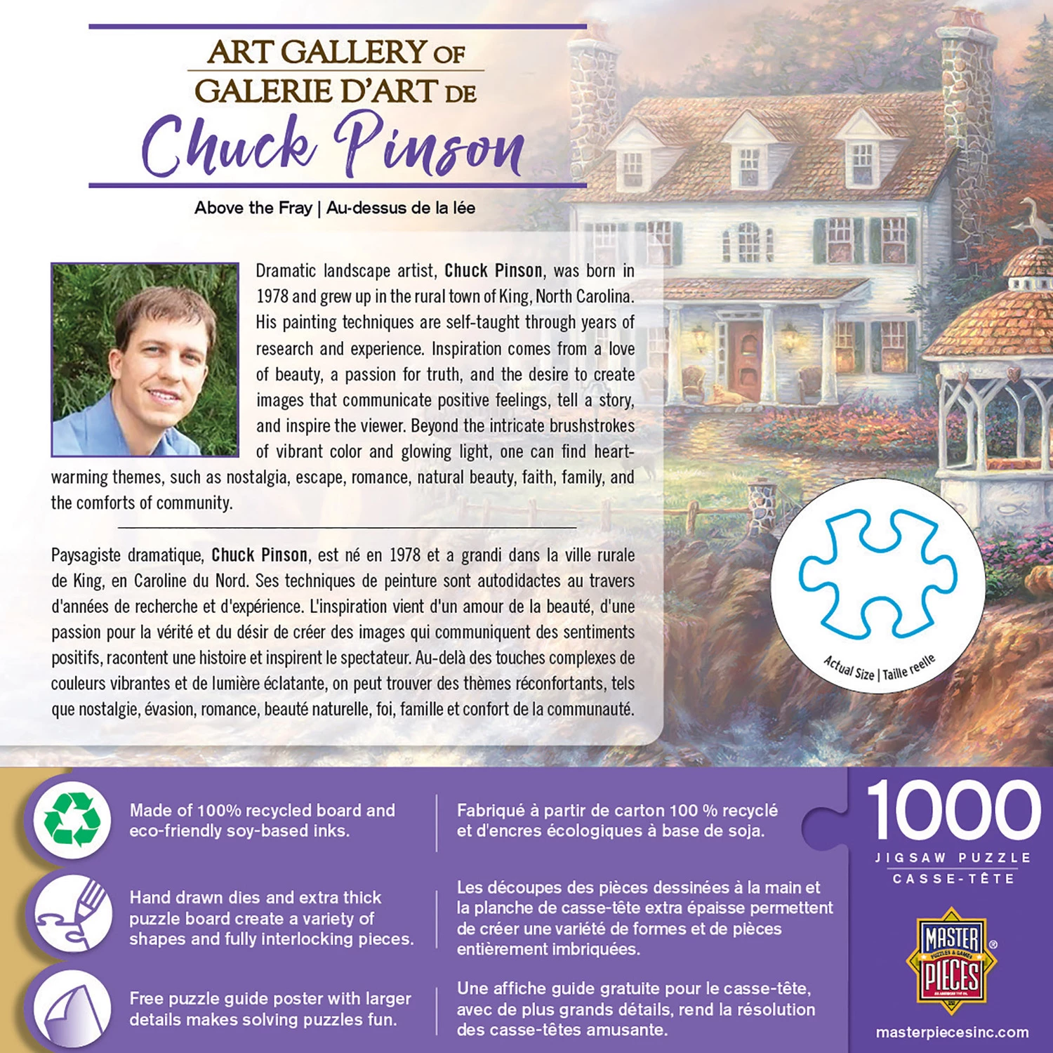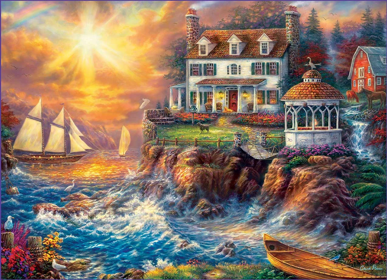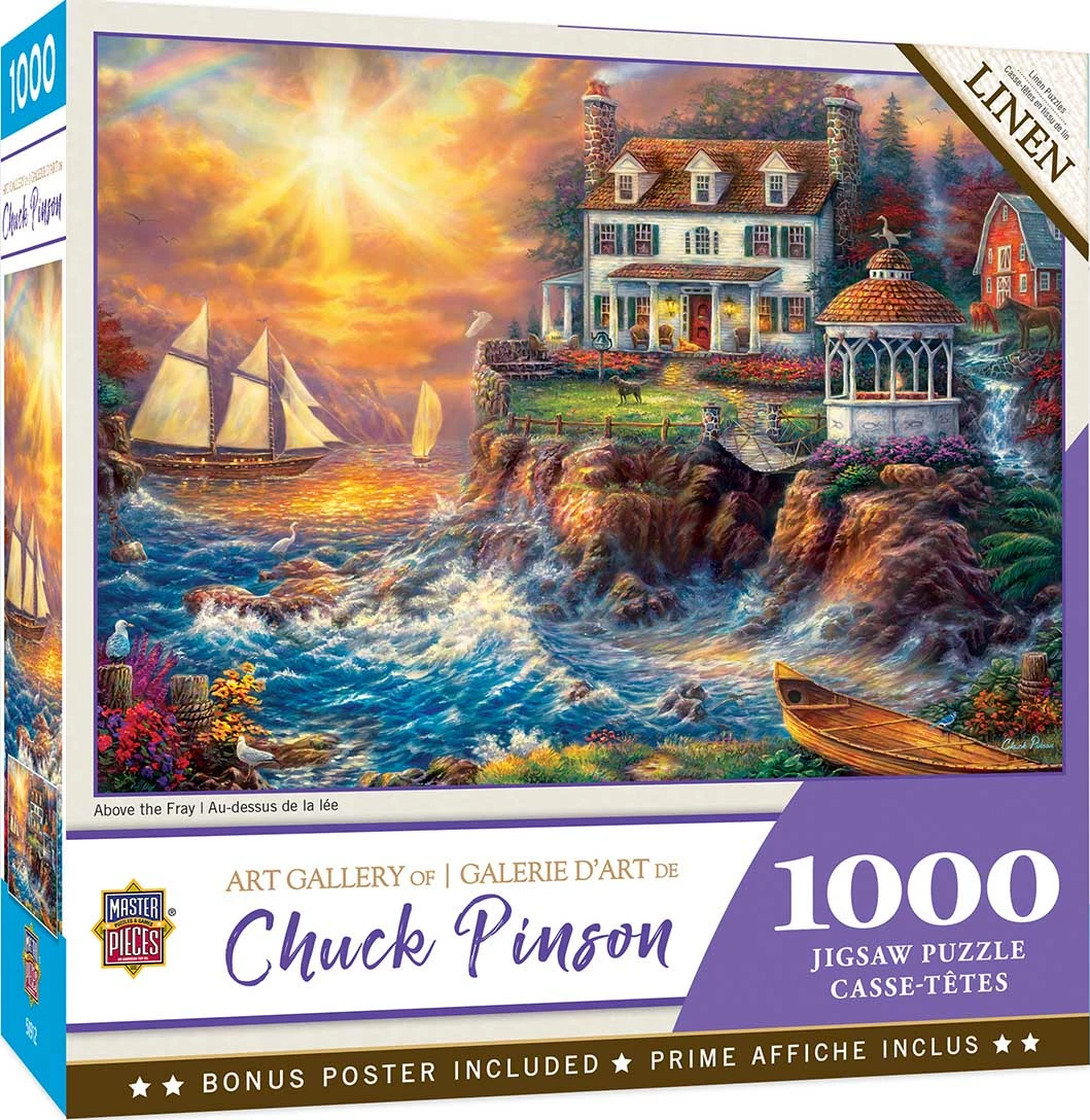 These MasterPieces 19.25″ x 26.75″ 1000pc Chuck Pinson puzzles.Β Waves crash on the cliffs below a beautiful home.Β With their timeless beauty, these puzzles are sure to offer you an afternoon of puzzling fun! Linen Finish on Packaging and Puzzle reduces and glare and creates a timeless classic look. To reduce their impact on our environment, the chipboard used in these puzzles is made of recycled material.