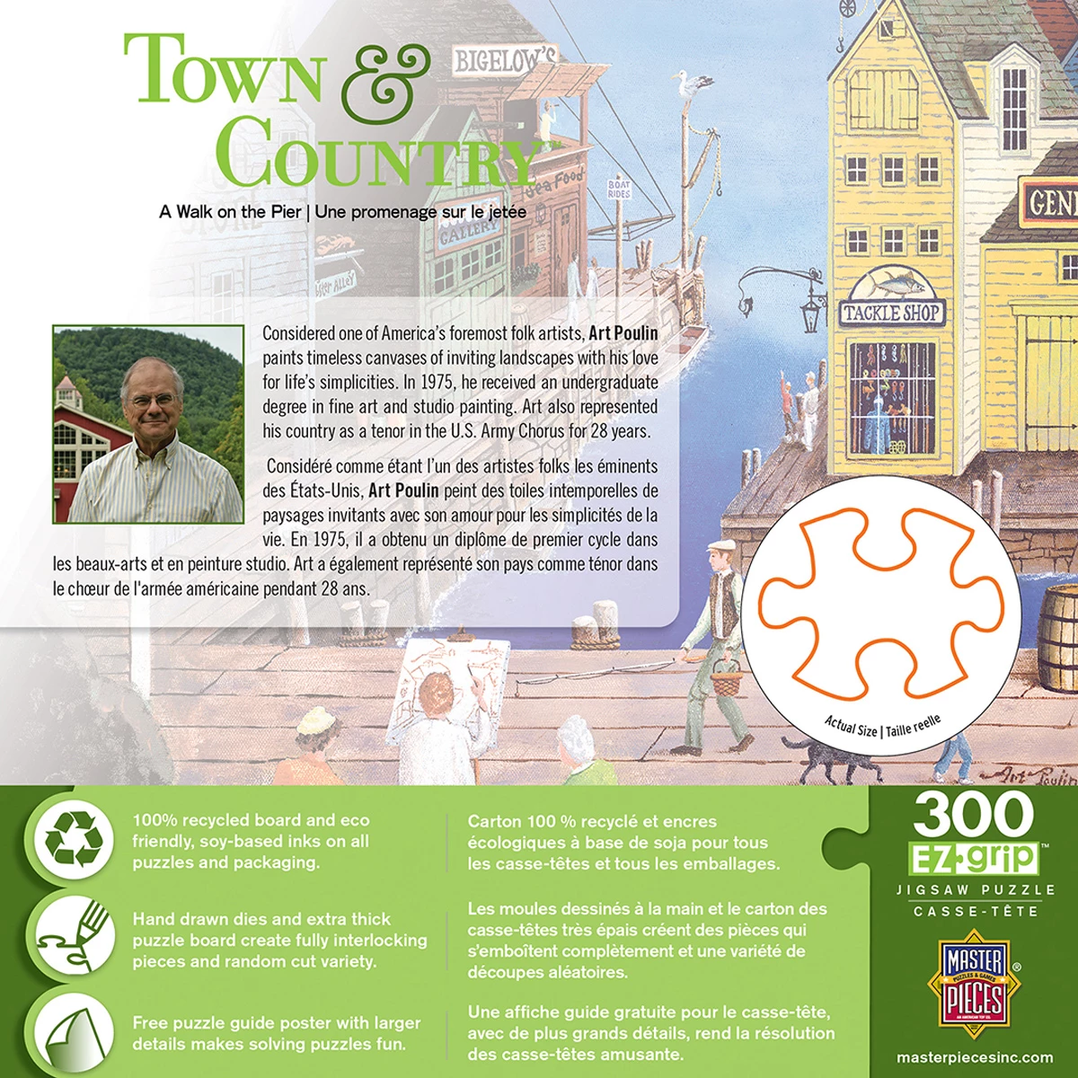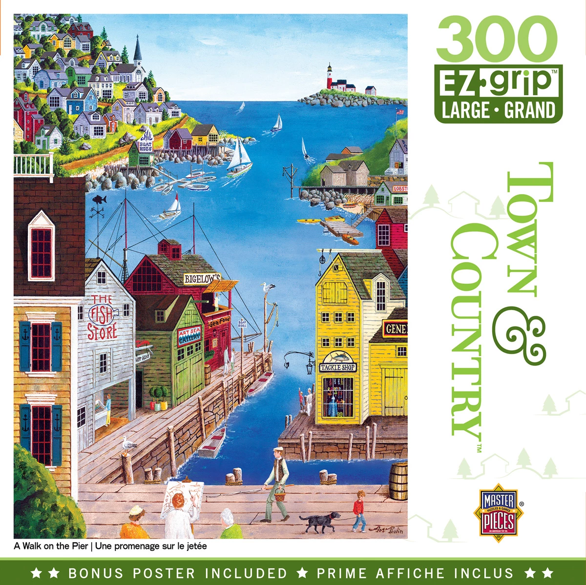 This MasterPieces 18″ x 24″ 300PC EZ Grip Town & Country Puzzle is the perfect way to sit back, relax, and enjoy the simple pleasures in life. The Town & Country collection features the work of the incredibly talented folk artist, Art Poulin. Considered one of America’s foremost folk artists, Art Poulin paints timeless canvases of inviting landscapes. On top of being a master folk artist, Art also served in the US Army for 27 years, and is a classical pianist. With a folksy village and bayfront view, and even an artist painting peacefully on the pier, this puzzle is sure to offer you an afternoon of puzzling fun! The EZ-Grip technology used to make this puzzle offers larger puzzle pieces that snap together perfectly, without compromising image quality. To reduce its impact on our environment, the chipboard used in this puzzle is made of recycled material.