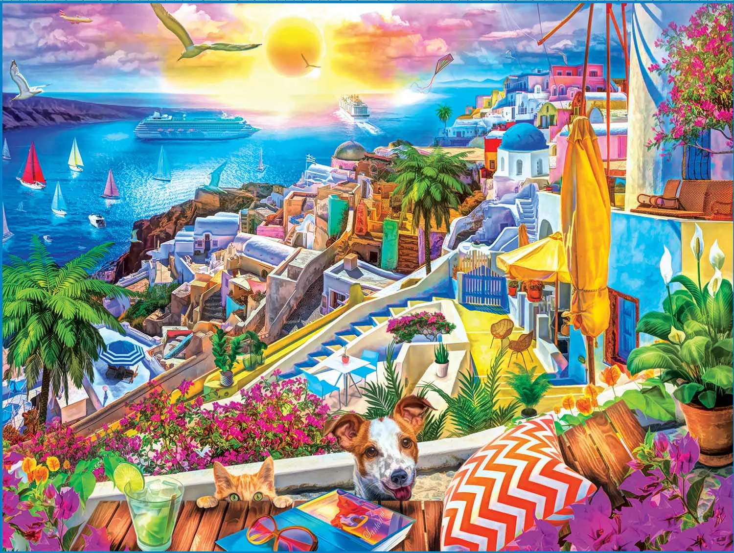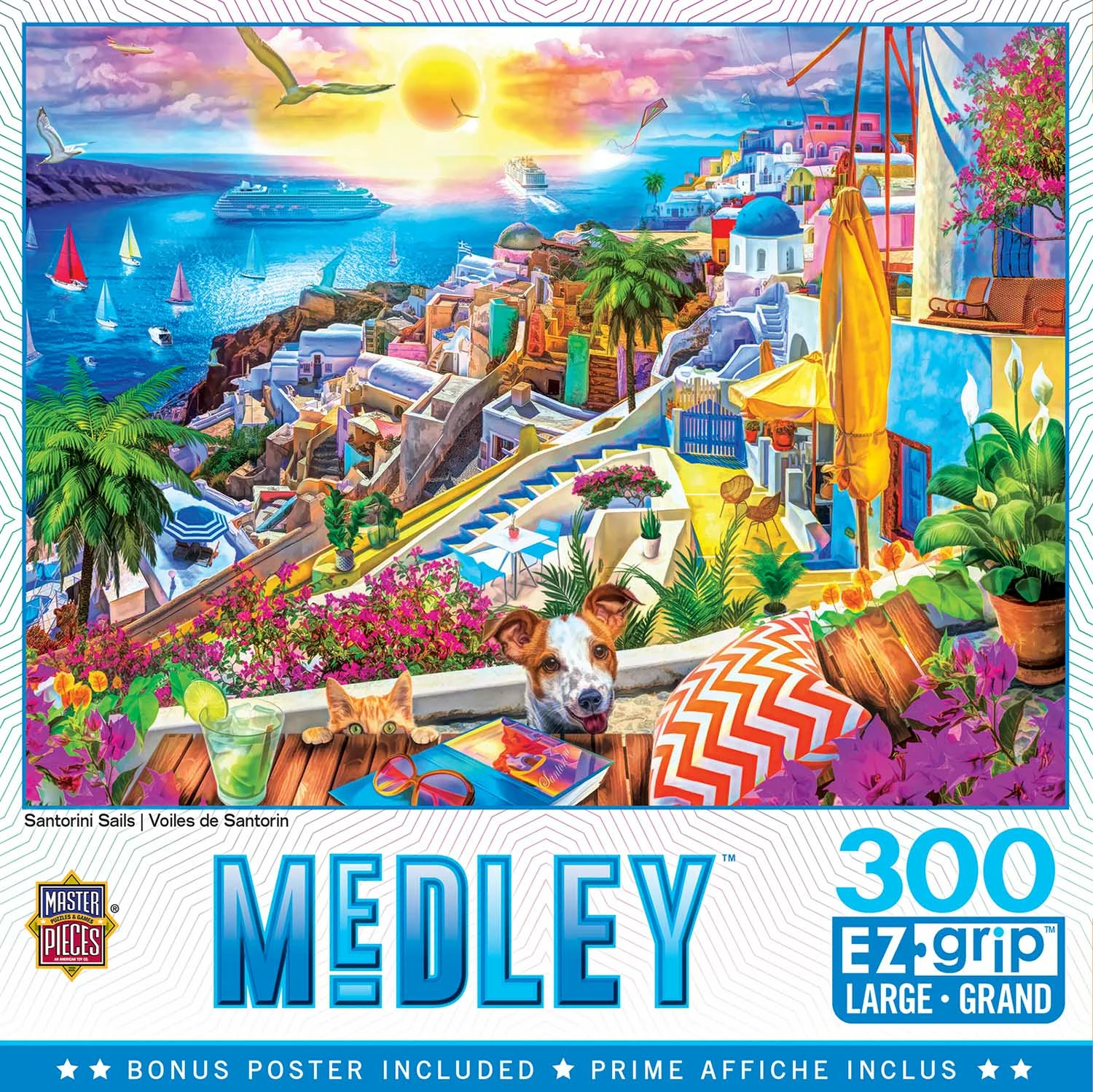 This MasterPieces 18″ x 24″ Medley 300PC EZ Grip Puzzle. Sun streaks the sky and lights up the colorful cliffs of Santorini, Greece. The EZ-Grip technology used to make this puzzle offers larger puzzle pieces that snap together perfectly, without compromising image quality. To reduce its impact on our environment, the chipboard used in this puzzle is made of recycled material.