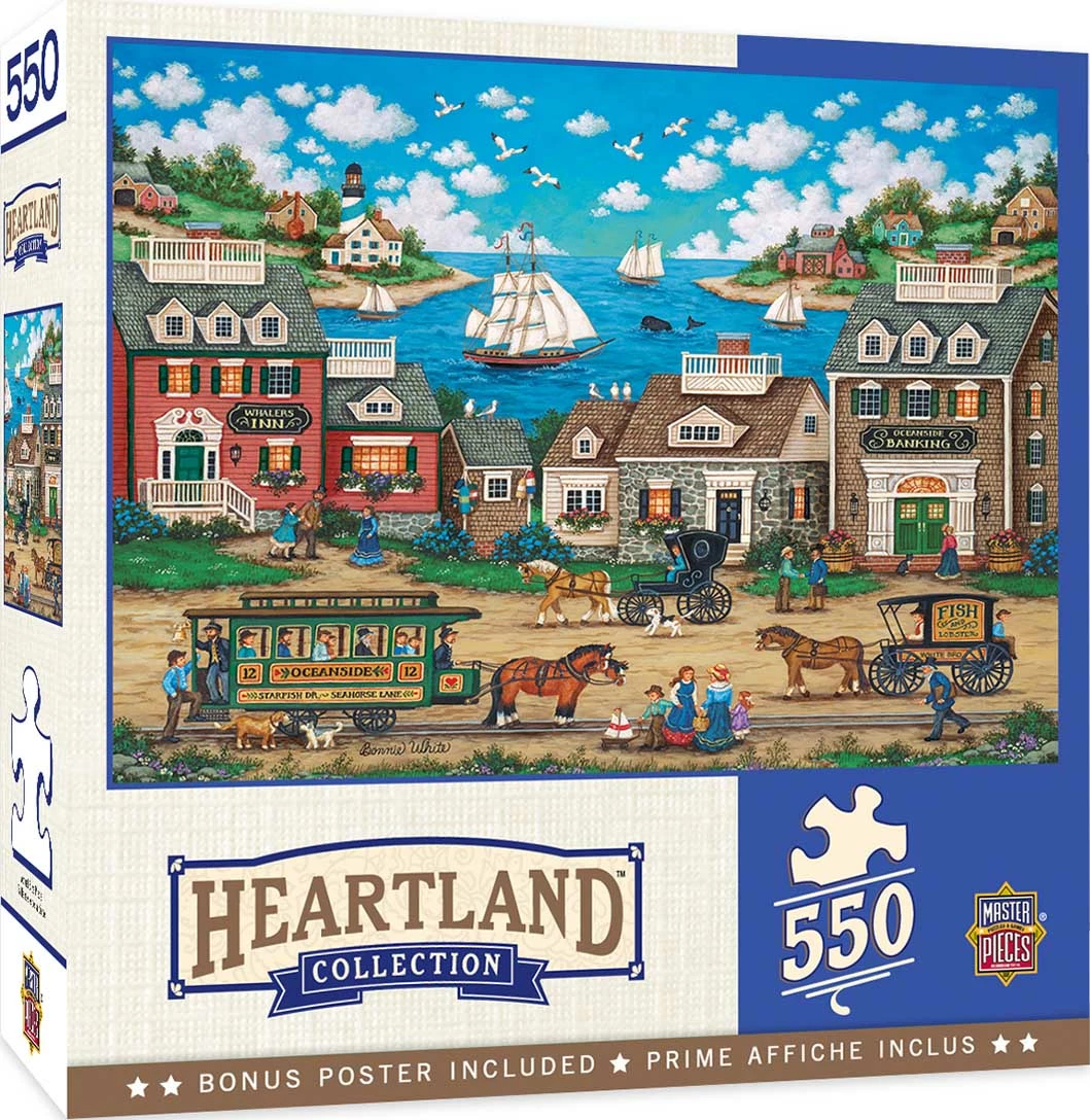 These MasterPieces 24″ x 18″ 550PC Heartland puzzles are created by the talented Bonnie White. Inspired by the charming scenery on her family’s farm in upstate New York, as well as neighboring mountains, valleys, and historic villages, Bonnie White creates beautiful landscapes of old-world folk art and culture. The Heartland line is no exception, with beautiful, detailed scenes ranging from quiet, seaside villages to villages bustling with activity. For more Bonnie White folk art, visit her website at www.bonniewhitefolkart.com. To reduce their impact on our environment, the chipboard used in these puzzles is made of recycled material.