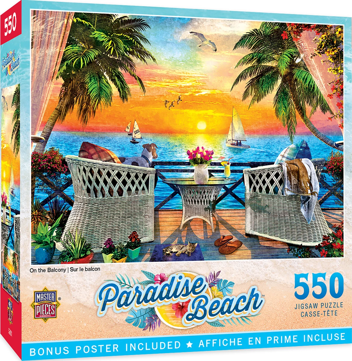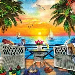 These MasterPieces 24″ x 18″ 550PC puzzle.Enjoy the view from a balcony overlooking pristine blue waters as the sun sets in colorful stripes across the evening sky. Sip on a tropical drink and take in the sea breeze in this relaxing scene.. To reduce their impact on our environment, the chipboard used in these puzzles is made of recycled material.