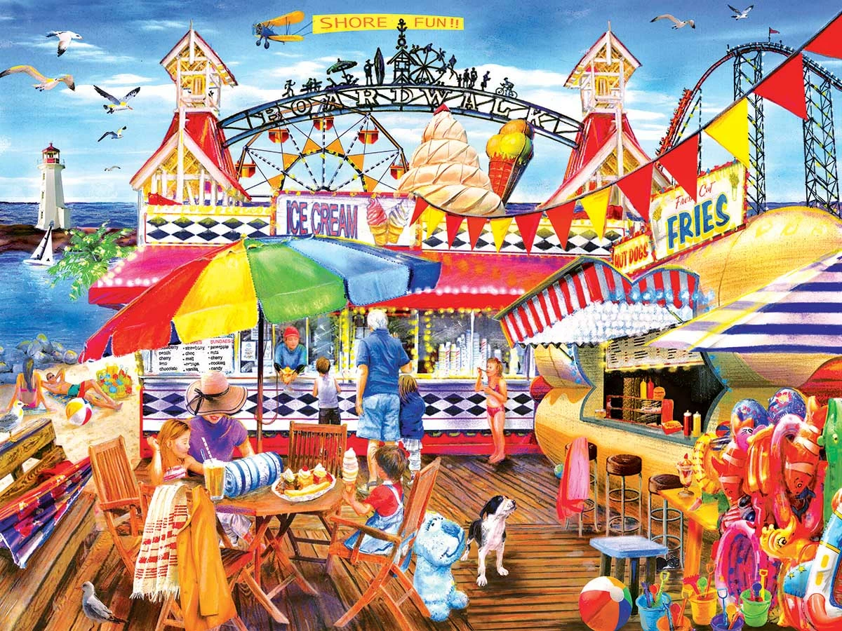 It’s a warm day at the shore. This bright and colorful image features all the things we love about a day at the beach. Oceans, beaches, and fun at the boardwalk.