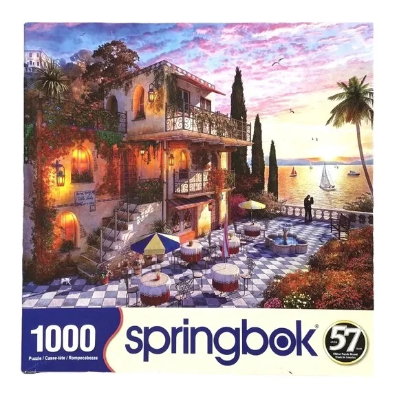Escape to the Mediterranean to a picturesque scene set at Sunset with Mediterranean Romance. This 1000 piece puzzle is beautifully illustrated and full of color. Enjoy the intricate details of the Mediterranean villa, sailboats, and skyline.