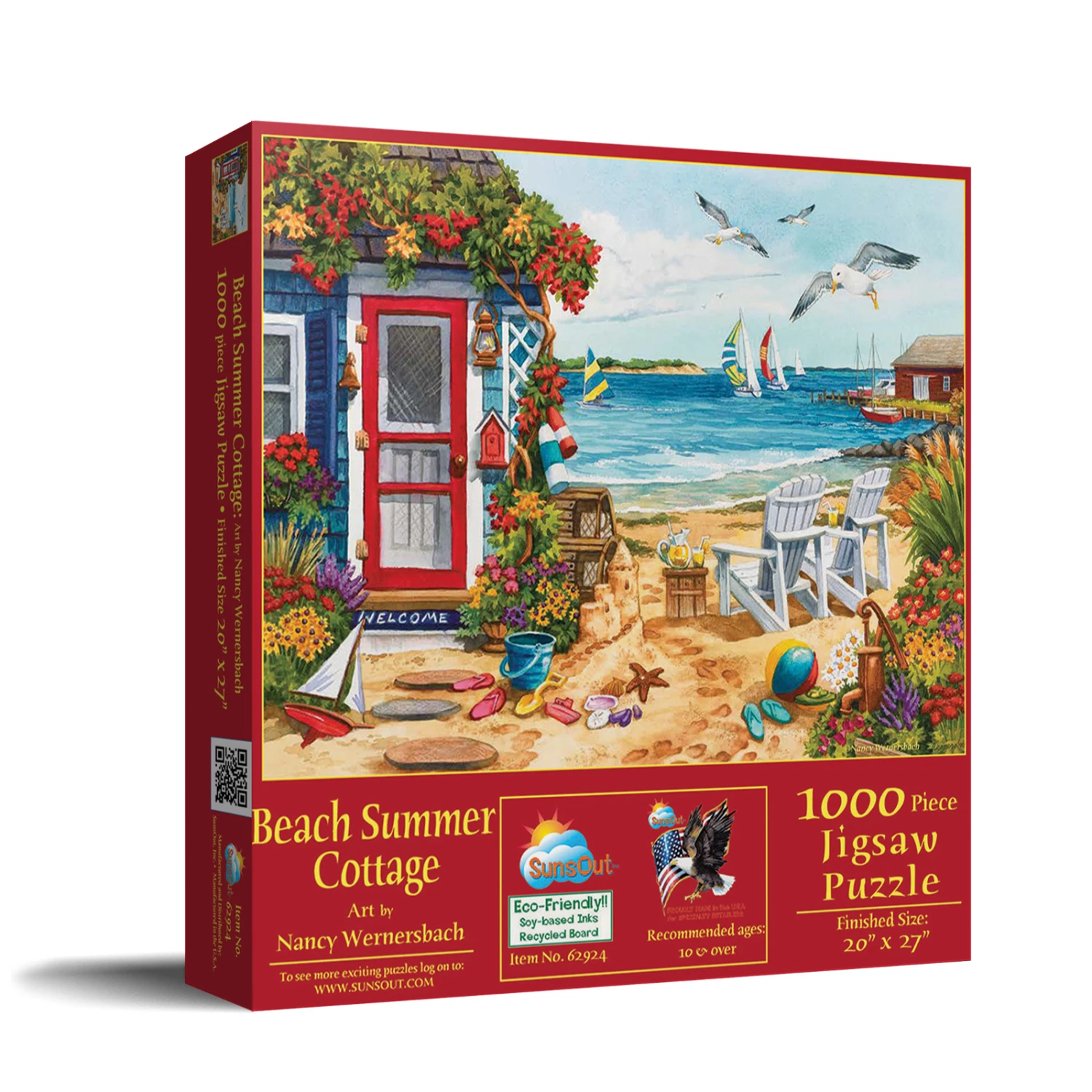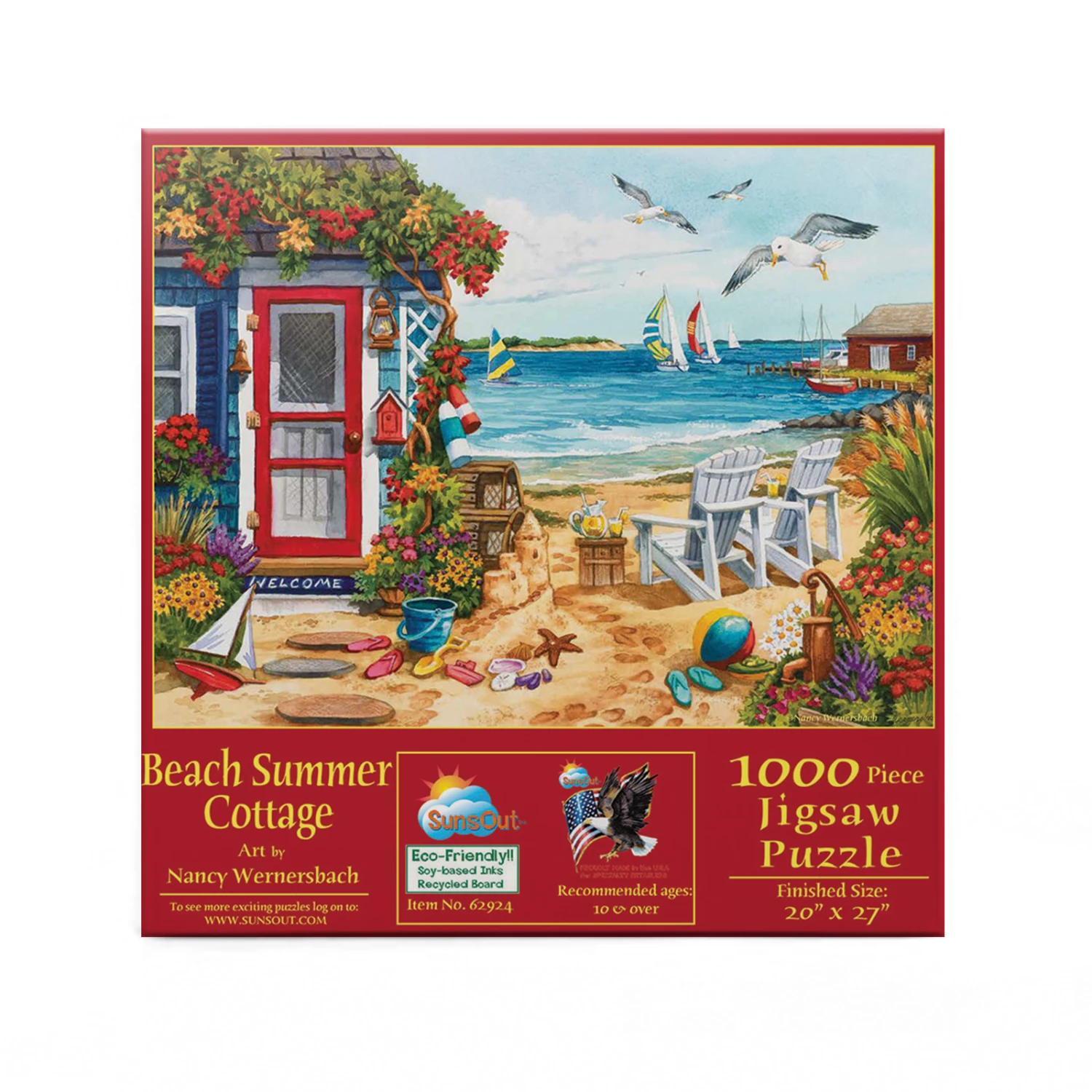 A beautiful coastal home is the feature of this SunsOut puzzle. βBeach Summer Cottageβ features the nautical artwork of Nancy Wernersbach. Lots of fun beach items are waiting to be pieced together such as flip flops, a beach ball, and a toy boat. The completed 1000 piece puzzle will measure 27β x 20β.