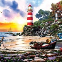 Piece together a nautical scene in βLighthouse Harborβ from SunsOut. The bright sky contrasts with the dark rocks lining the beach. Two boats have anchored for the night while a ship sails out to sea in the distance. The 1000 piece puzzle will measure 27β x 20β when complete and features artwork from Image World.