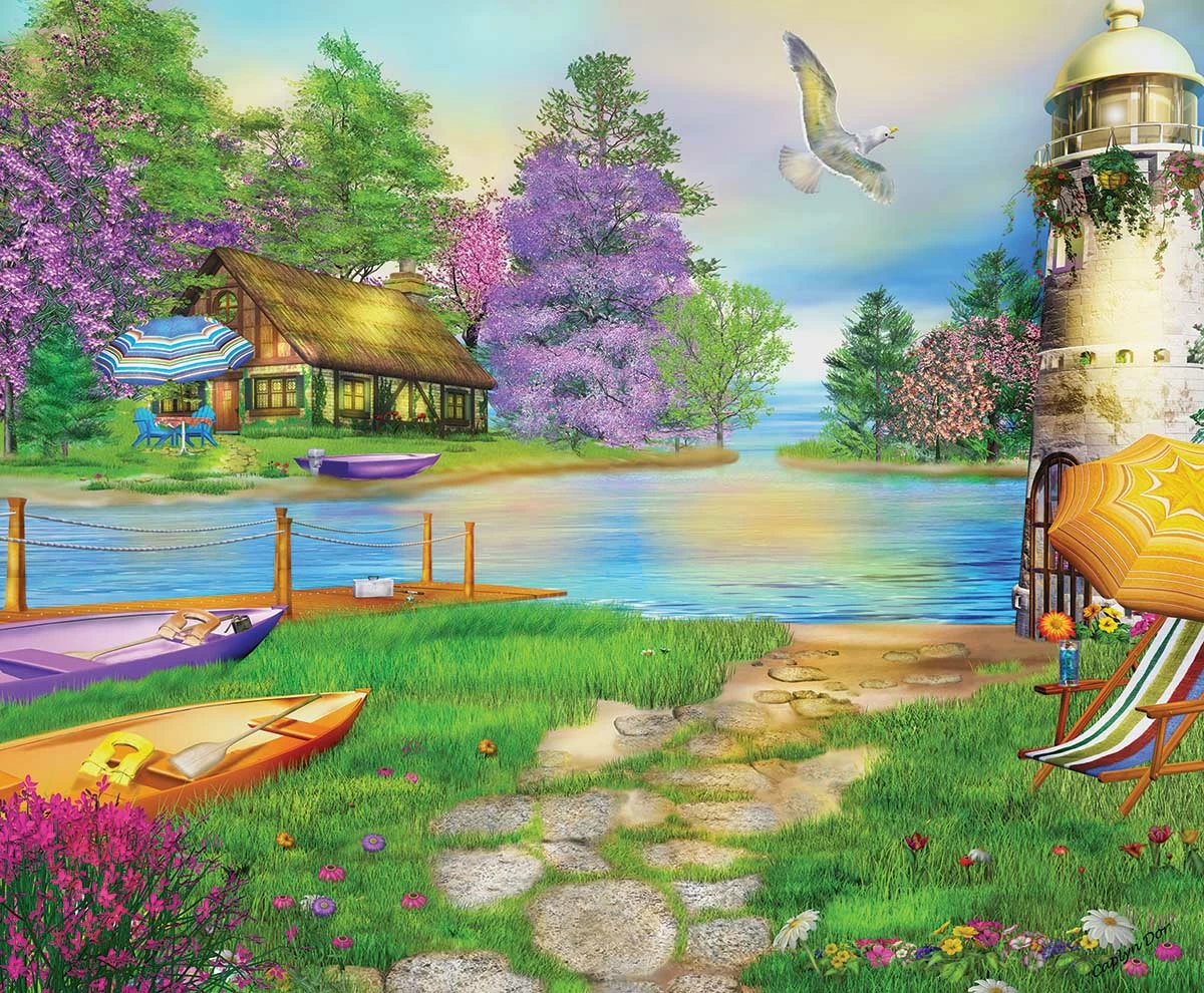 Piece together a relaxing day by the bay in SunsOutβs βSeagull Bayβ. This 1000 piece puzzle features the calming artwork of Caplyn Dor. The image depicts a lighthouse, kayaks, and a gorgeous bay. The completed puzzle will measure 23β x 28β.Β