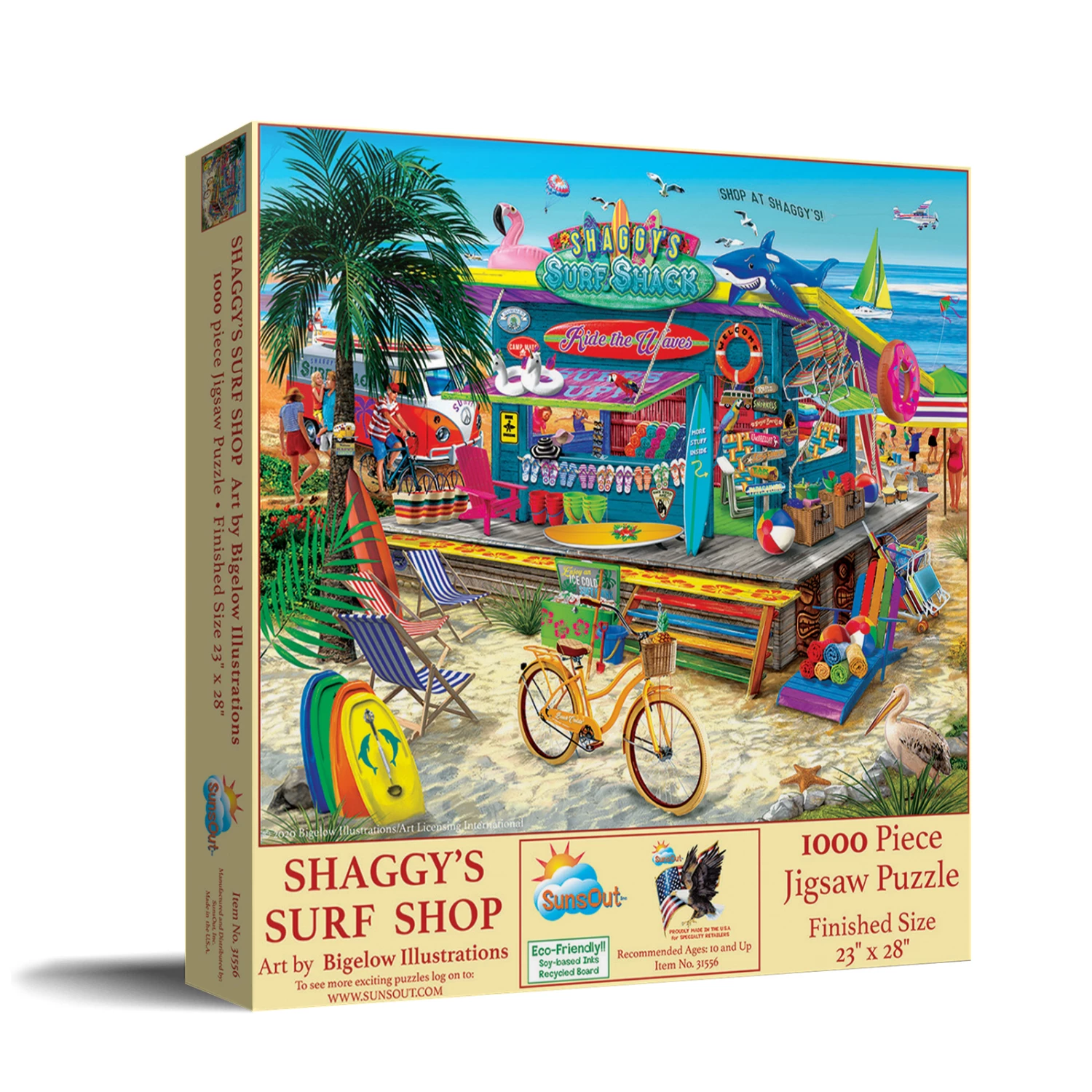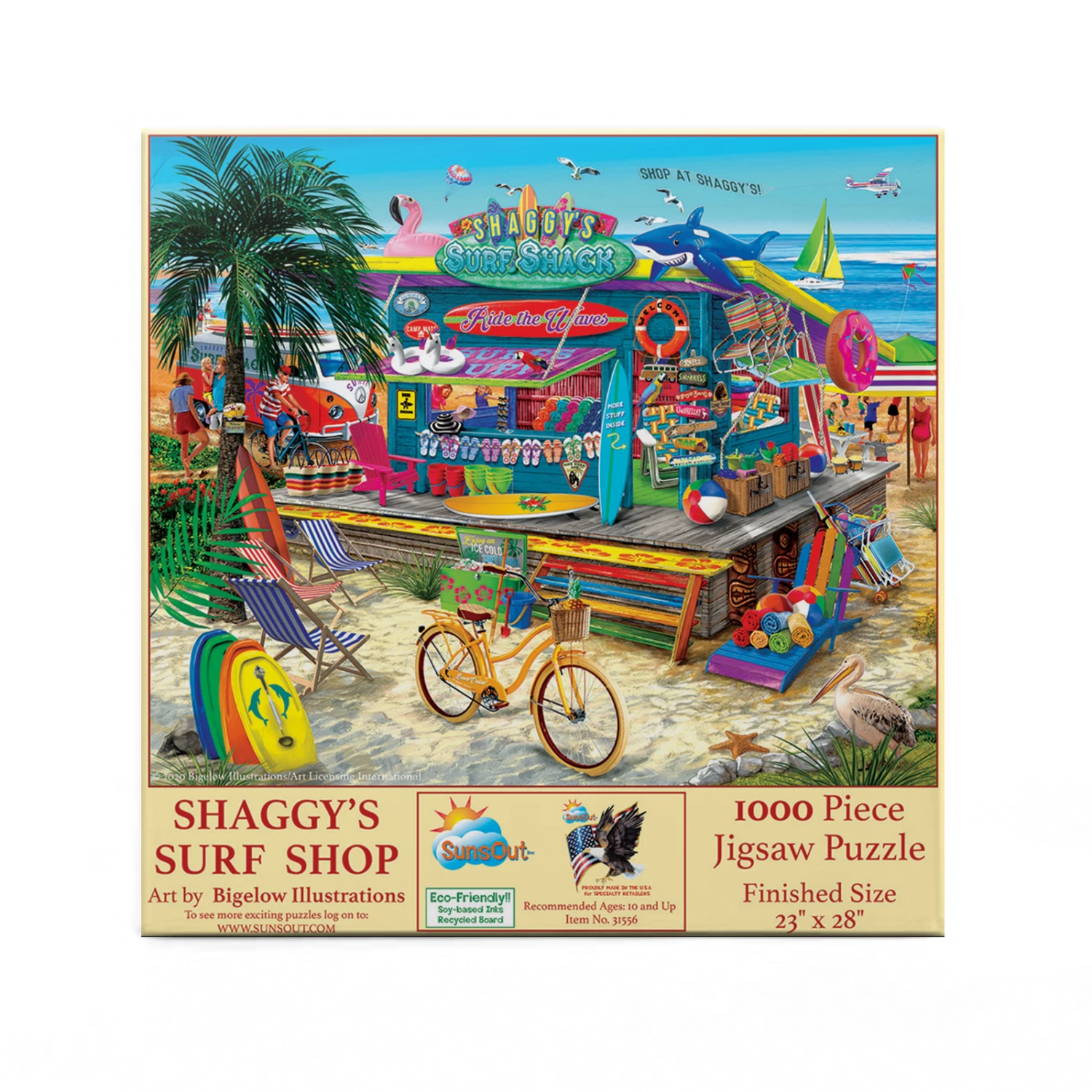 Get all your beach needs at Shaggyβs Surf Shop! This bright and colorful puzzle from SunsOut features some fun elements. From a donut floatie to palm trees to surfboards, this puzzle will keep you entertained.Β