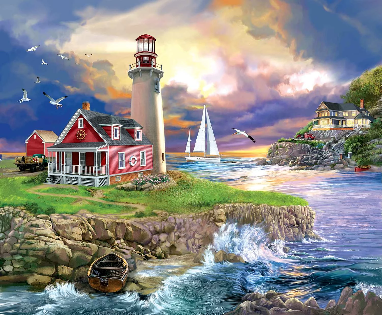 In this 1000 piece jigsaw puzzle from Sunsout, Sunset Point is the perfect destination for some jigsaw puzzle fun! With a towering lighthouse and the gorgeous colors of a sky at dusk, this puzzle is guaranteed to be a blast. The puzzle features artwork from Bigelow Illustrations and will measure 28″ x 23″ when completed.