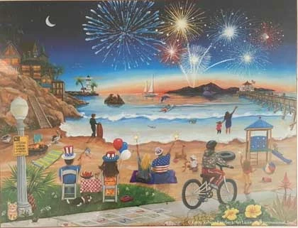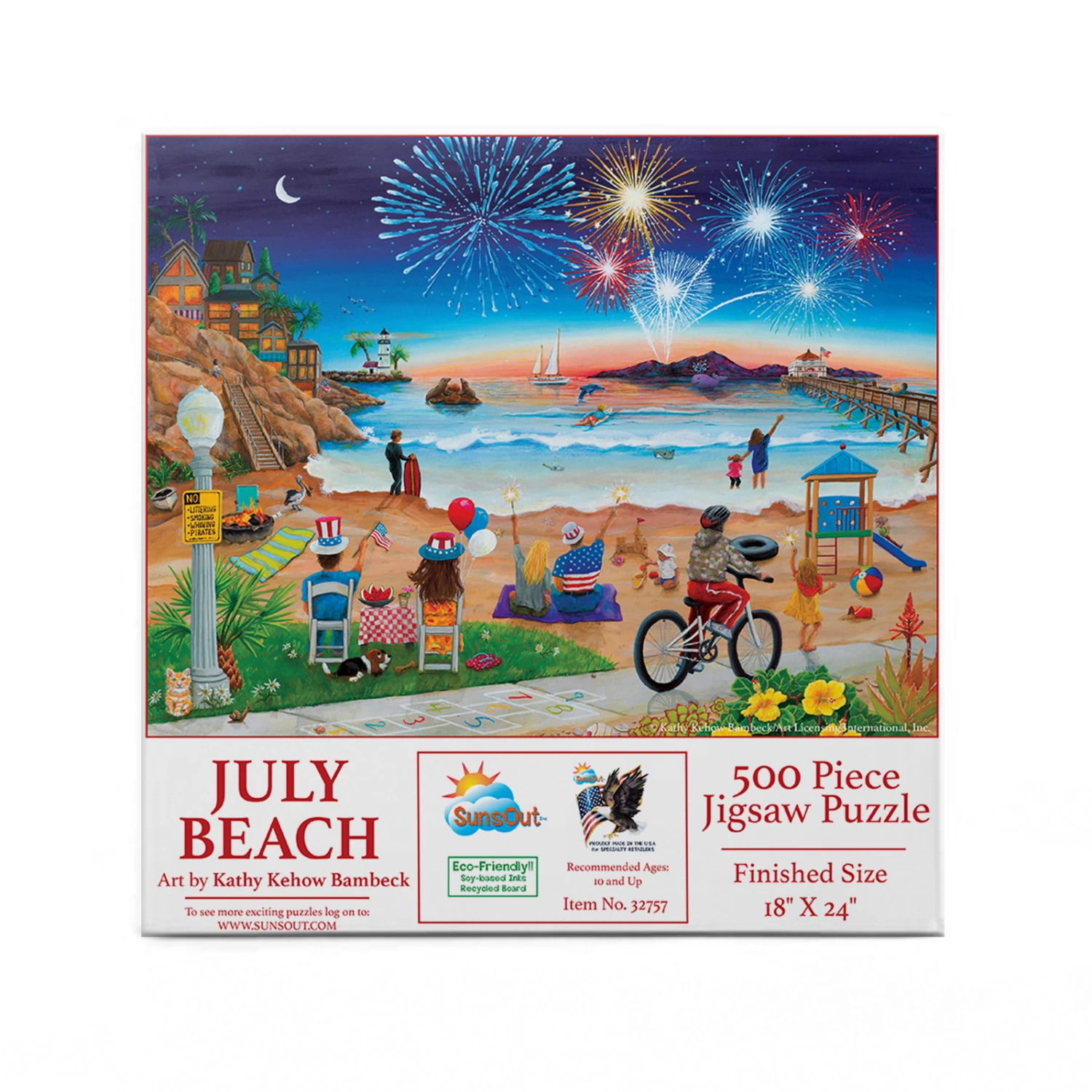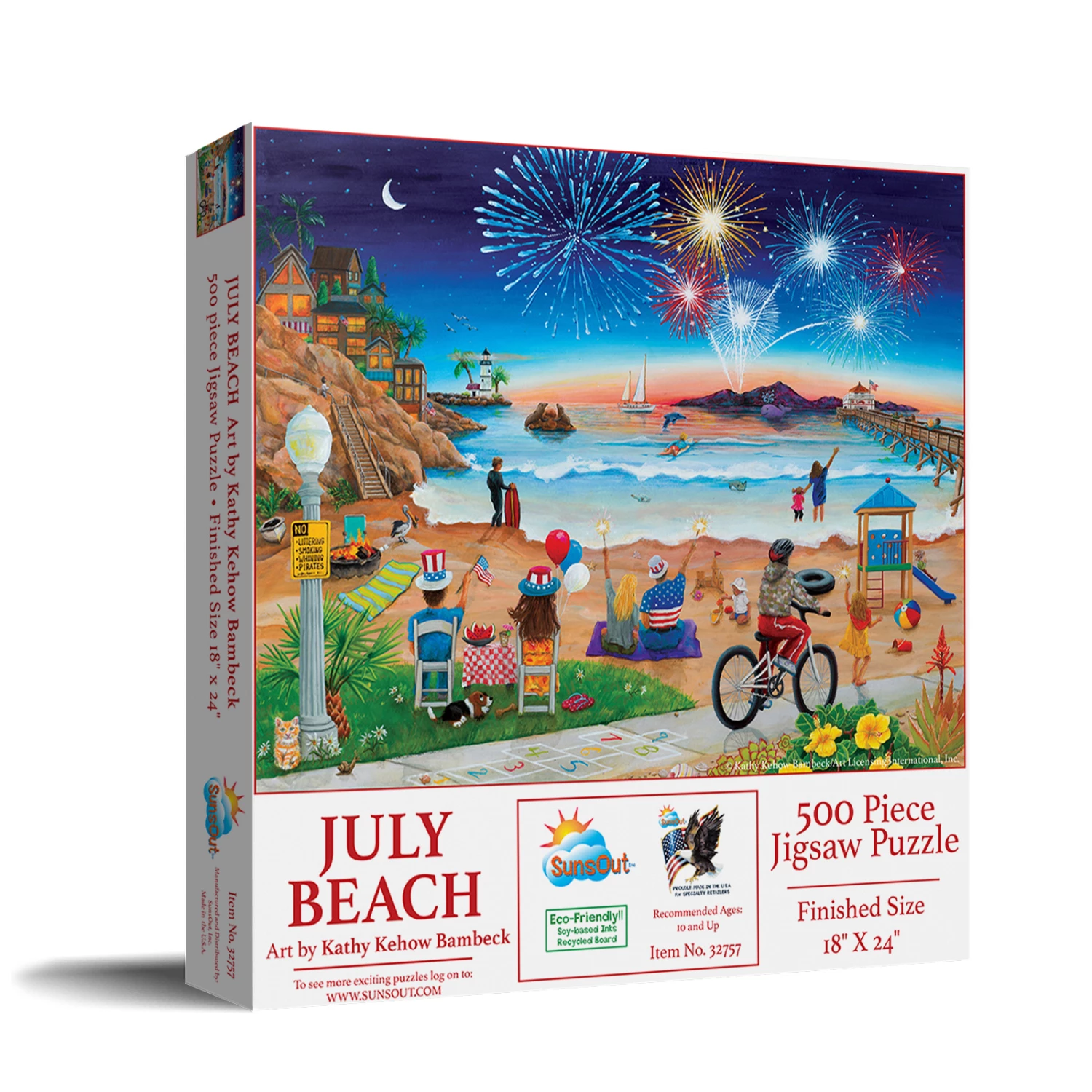 A patriotic 4th of July celebration is taking place as fireworks light up the sky in “July Beach” from SunsOut. The artwork for the puzzle comes from artist Kathy Kehow Bambeck. This colorful puzzle would be great to do with family and friends around the holiday! The completed 500 piece puzzle will measure 24” x 18”.