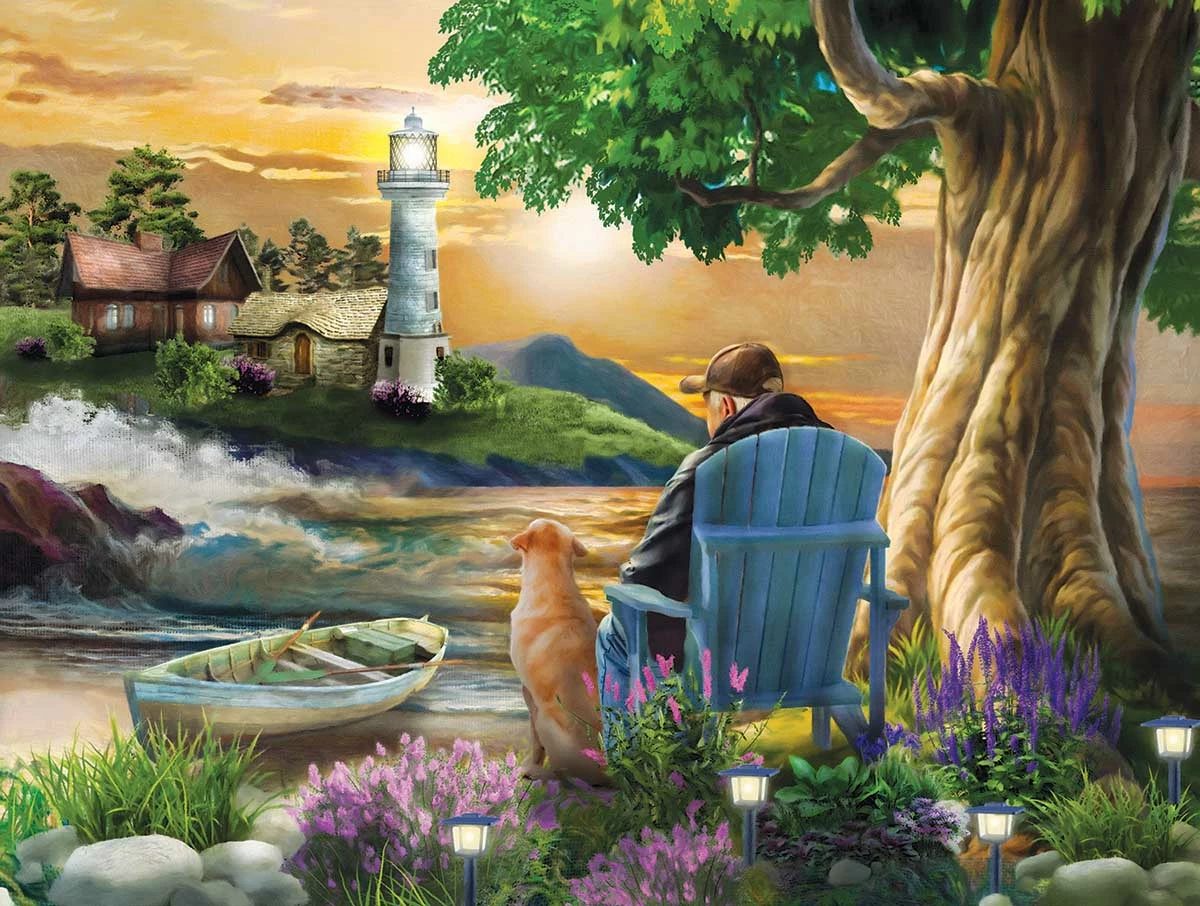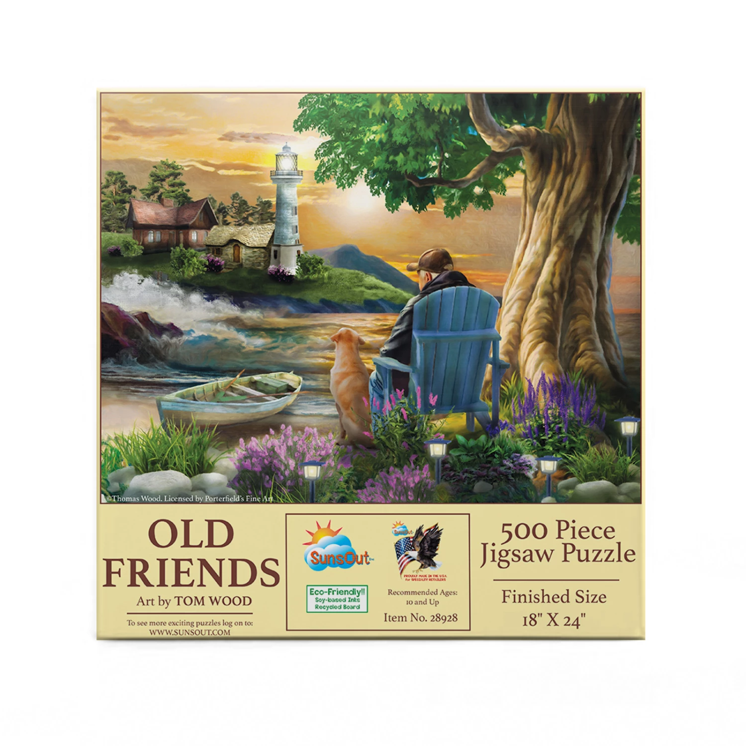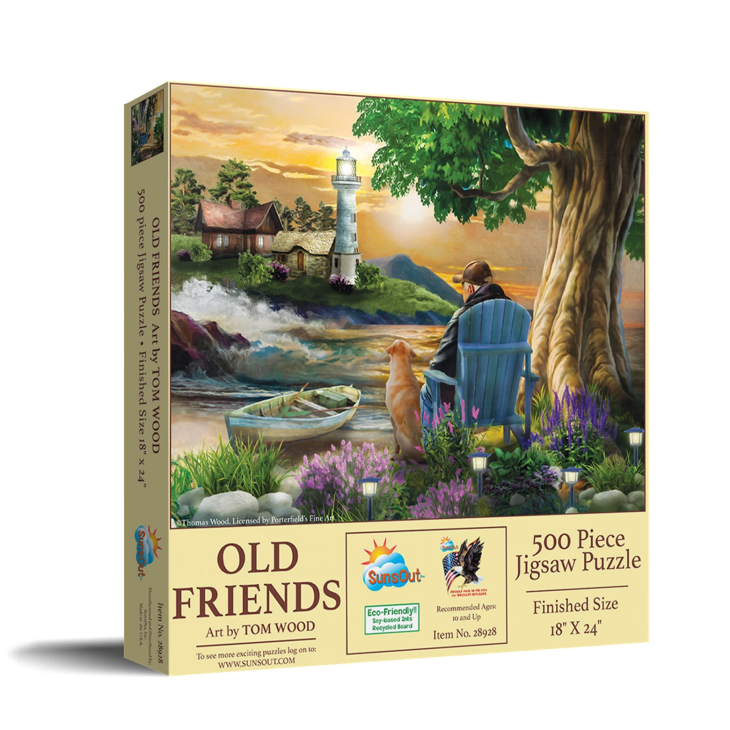 A man and his dog watch the waves crash onto the shore in βOld Friendsβ from SunsOut. This 500 piece puzzle features the artwork of Tom Wood. This relaxing image will measure 24β x 18β when complete.